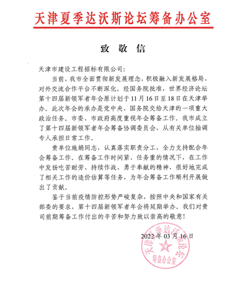 日前,天咨公司所屬招標公司收到天津夏季達沃斯論壇籌備辦公室發(fā)來的致敬信,充分肯定了招標公司為天津夏季達沃斯論壇年會籌備工作所作的積極努力。