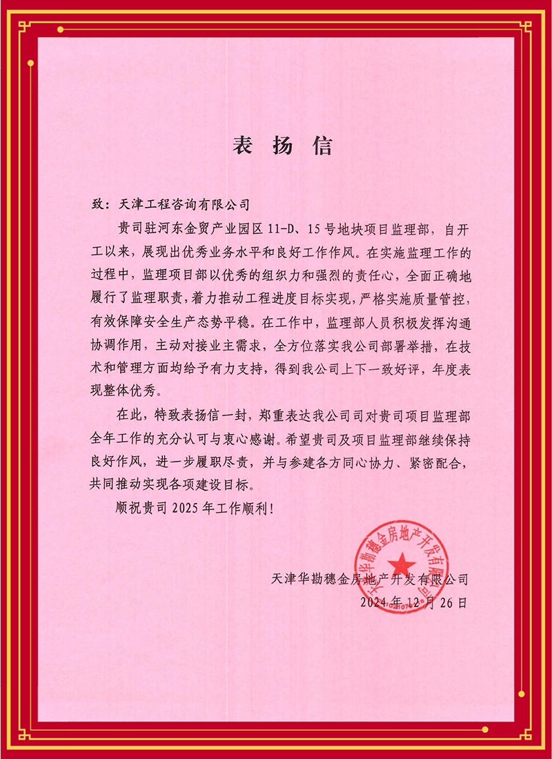津濱輕軌9號線信號系統更新改造工程項目部感謝監理團隊多舉措解決項目施工作業接口復雜、改造期間運能不降、新舊系統無縫切換等難題,力保施工、運營“雙安全”;天津長遠嘉和置業有限公司贊賞含璋寶坻項目怡錦園項目監理團隊以高度的責任心、高效的組織協調管理和扎實的專業技能推動項目圓滿完成;天津華勘穂金房地產開發有限公司感謝監理項目部主動對接業主需求,有效管控質量安全,切實保障施工進度,很好地履行監理職責......