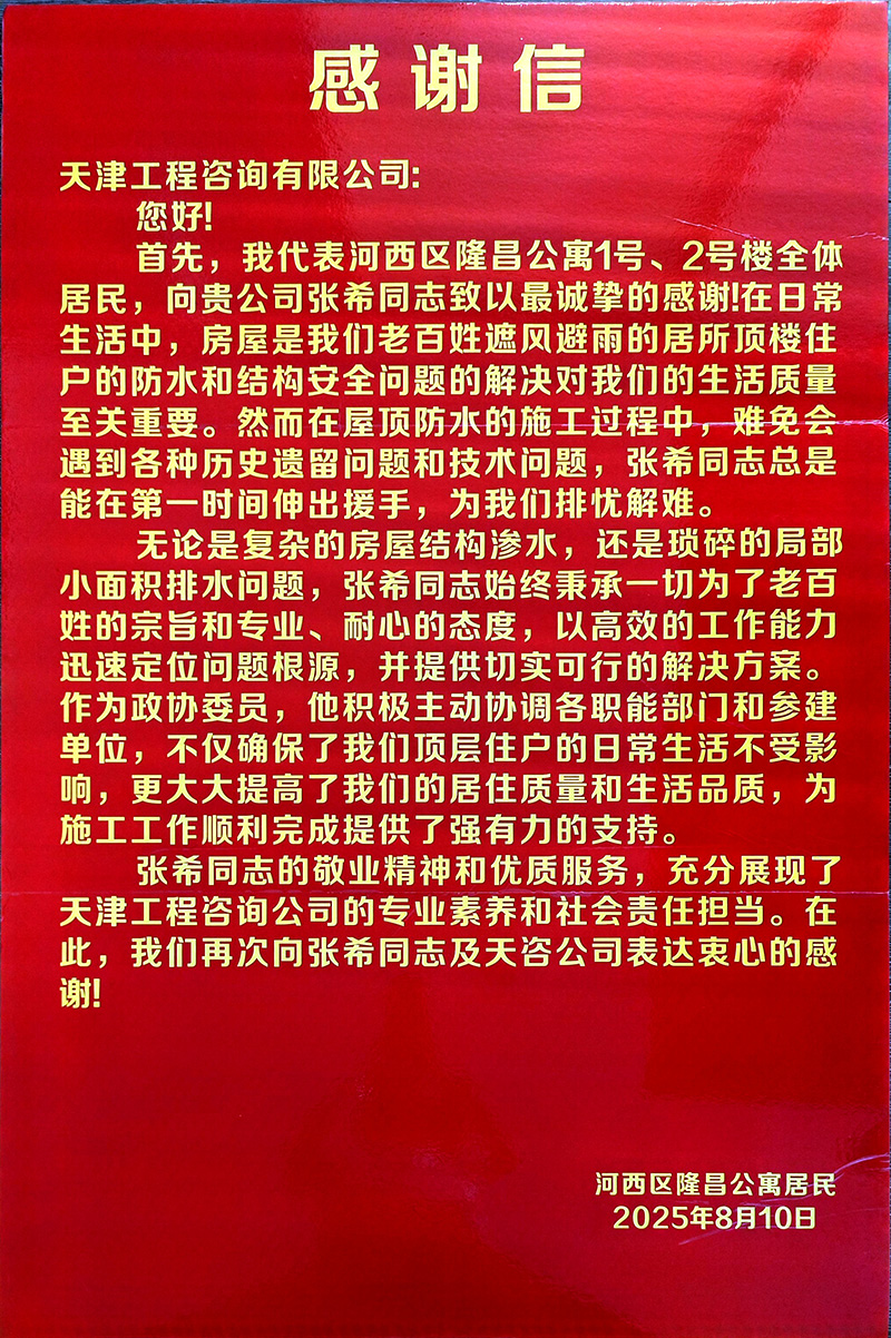 為有效促進(jìn)工程進(jìn)展,項目團(tuán)隊主動加強與居民、街道和社區(qū)的多層次溝通。在各小區(qū)設(shè)立聯(lián)絡(luò)點,及時公開施工與監(jiān)理信息,迅速響應(yīng)居民關(guān)切。如隆昌公寓屋面滲水問題,團(tuán)隊僅用三天便協(xié)調(diào)解決,展現(xiàn)出高效務(wù)實的作風(fēng)。施工前主動告知計劃,協(xié)助居民做好防護(hù),合理安排作業(yè)時間避開休息時段,還為年長體弱居民提供搬運幫助。這些細(xì)致入微的服務(wù)贏得了居民的廣泛贊譽,特地送來感謝信,表揚團(tuán)隊“專業(yè)、耐心、高效”。