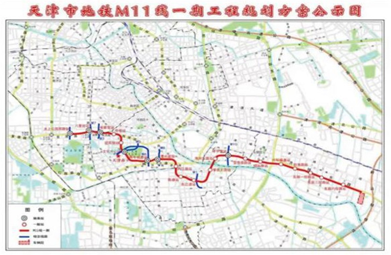 天津地鐵11號(hào)線一期工程線路全長(zhǎng)22.6公里,共設(shè)21座車站,均為地下站。在東麗區(qū)設(shè)置七經(jīng)路定修段一座。本工程設(shè)有兩座主變電所,新建六里臺(tái)主所1座與7號(hào)線共享,新建馴海路主所1座,與Z1線共享,正線設(shè)置牽引變電所11座,定修段獨(dú)立設(shè)置 1座牽引變電所。控制中心一處,設(shè)置在華苑車輛段內(nèi),另外在七經(jīng)路定修段設(shè)備用控制中心一處。概算總投資256.02億元。