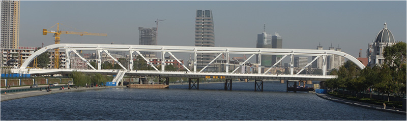 該橋橫跨張自忠路、海河以及海河?xùn)|路。橋梁總長(zhǎng)180米,主跨128米,面積4985.2 平米,為自錨式桁吊組合鋼結(jié)構(gòu)橋。總投資2.65億元。該橋梁設(shè)計(jì)在國(guó)內(nèi)外尚屬首創(chuàng)。